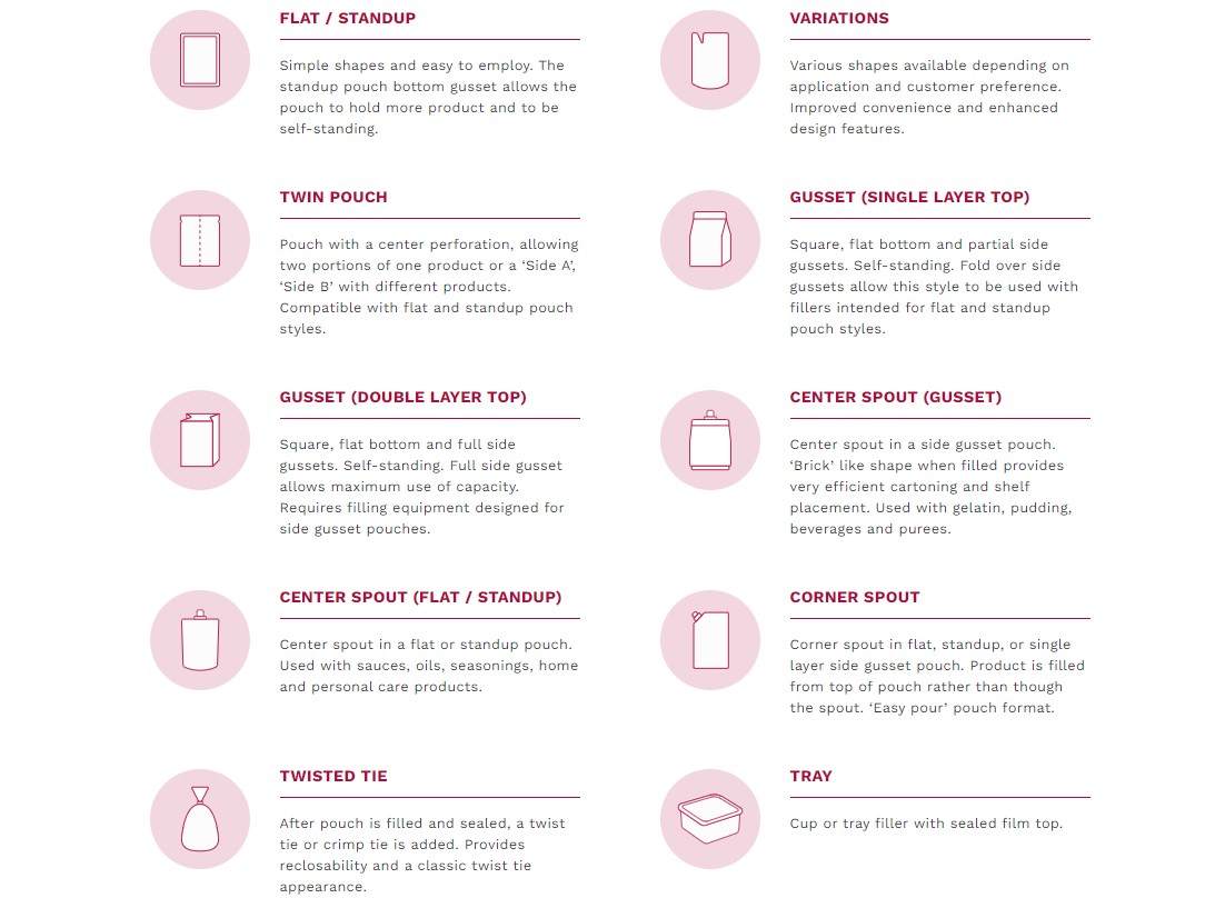 This style of pouch has a square shape, flat bottom and partial side gussets. It is self-standing and can be used with fillers designed for flat and standup pouch styles, thanks to its fold-over side gussets.